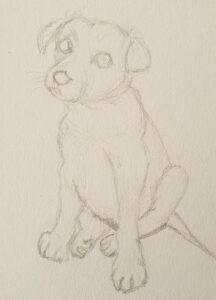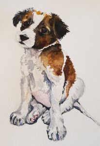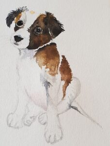 Once you are satisfied with the shadows, look to the final details. Add the whiskers and finalise the muzzle. Use some white acrylic to add white “fur” in places where you think it should stand out. I recommend a very limited use of this using a very fine brush. (It does have a tendency to appear yellowish on the white paper). Now you are finished! Add your million dollar and you’ve completed your painting of a puppy.