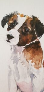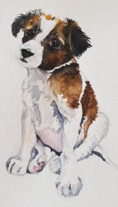 Spend as much time as possible on the eyes and face of the puppy. The eyes in particular are the focus of this painting and need to be as soft and appealing as possible. Note the highlights left in both eyes and the lighter parts of fur around the eyes. I also “lifted” some paint off around the top of both eyes with toilet paper to add a softness to the face.